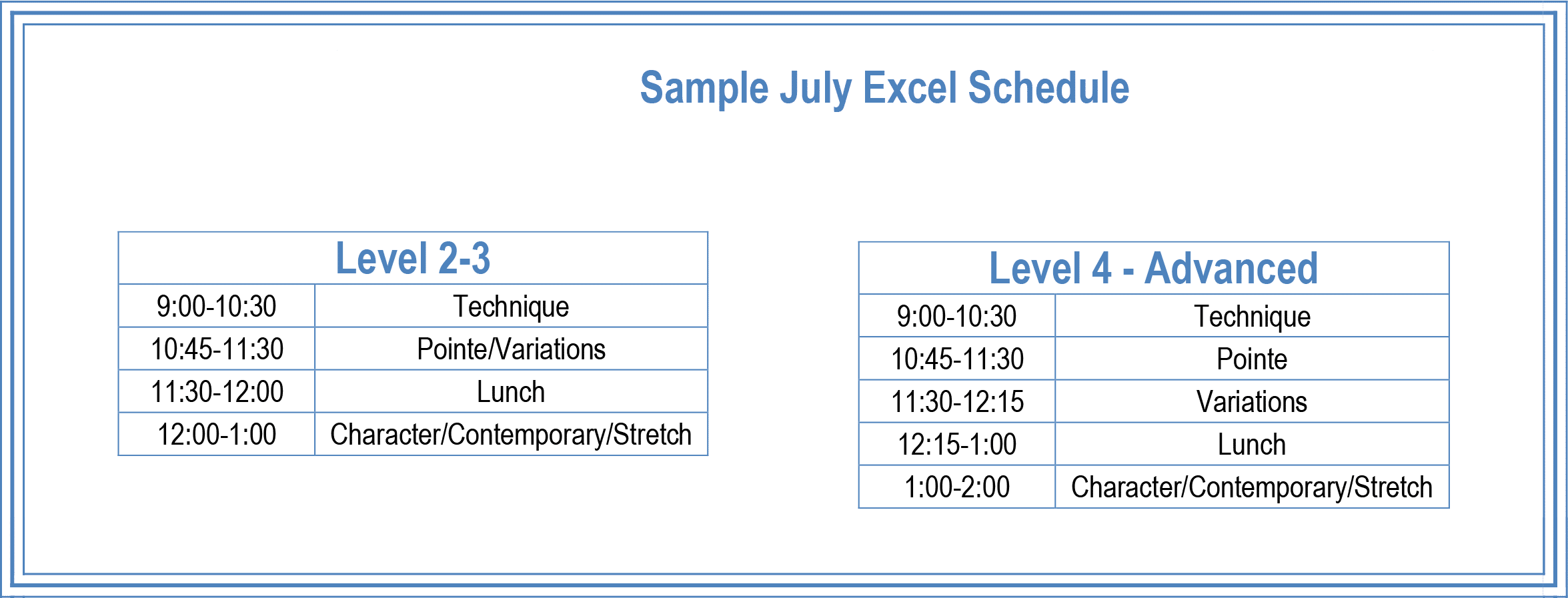 Curriculum: ballet technique, pointe/pre-pointe, contemporary, variation, and stretch.